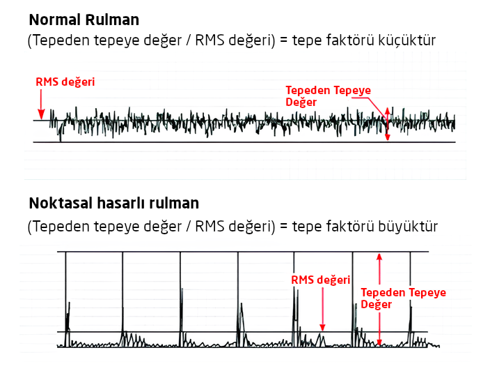 - Rulman Kusurları: Aşınmış veya hasarlı rulmanlar, yüksek frekanslı darbeler üreterek tepe faktörünü artır.